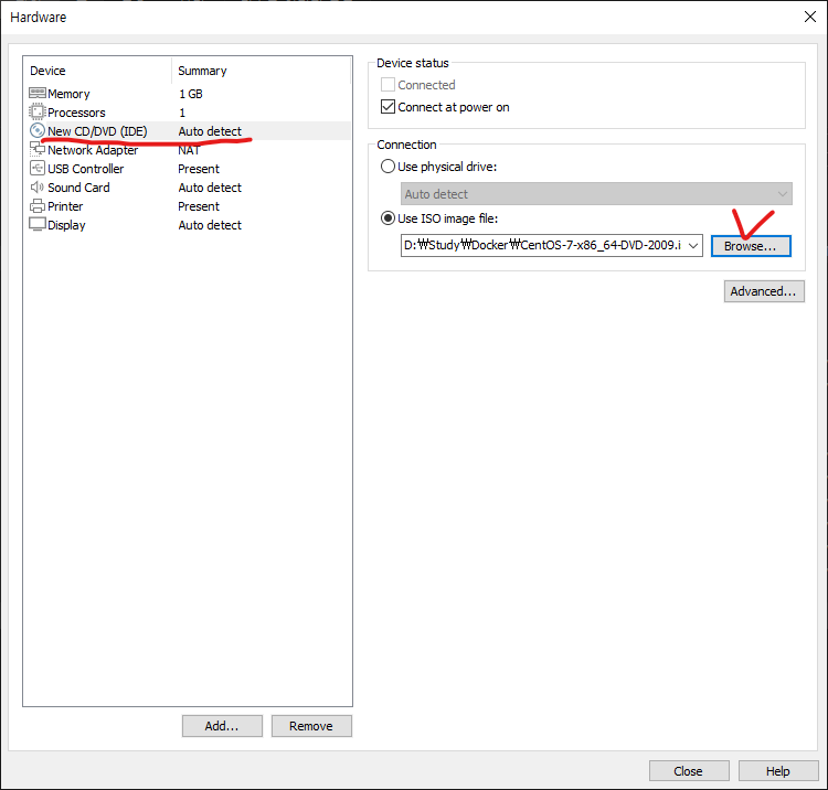 6. New CD/DVD 를 누르고 Use ISO image file을 선택하고서 다운받은 이미지 파일을 넣고 close해서 닫는다.(저장됨)
