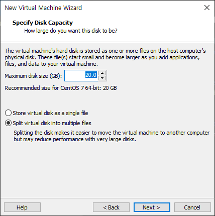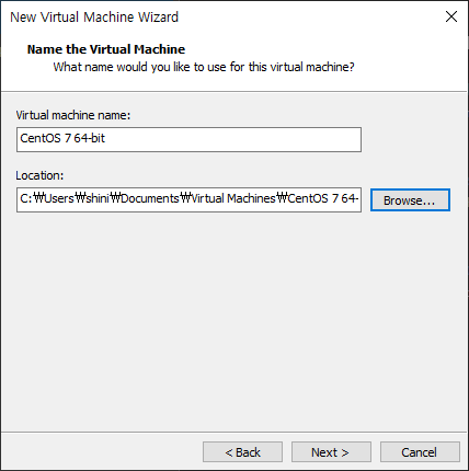 3. 가상머신 이름과 설치할 공간을 선택 (본인은 CentOS 7 설치중이라 이름을 저렇게 했다.)
