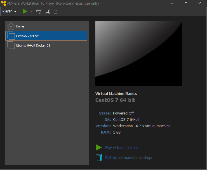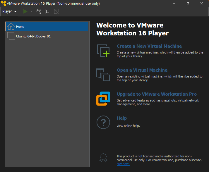 VMware를 키면 아래와 같은 창을 볼 수 있다. (Ubuntu 64-bit Docker 01은 이미 하나 깔아놔서 그런거 아마 처음이면 Home밖에 없을꺼다.) 오른쪽 메뉴 중에 Create a New Virtual Machine 을 눌러 생성한다.